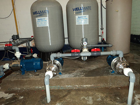Los Sistemas Hidroneumáticos basado en el principio de compresibilidad o elasticidad del aire cuando es sometido a presión, funcionando de la siguiente manera: El agua que es suministrada desde la fuente, es retenida en un tanque de almacenamiento; de donde, a través de un sistema de bombas, será impulsada a un recipiente a presión, y que posee volúmenes variables de agua y aire. Cuando el agua entra al recipiente aumenta el nivel de agua, se comprime el aire y aumenta la presión, cuando se llega a un nivel de agua y presión determinados (Pmáx.), se produce la señal de parada de bomba y el tanque queda en la capacidad de abastecer la red; cuando los niveles de presión bajan, a los mínimos preestablecidos (Pmín.) se acciona el mando de encendido de la bomba nuevamente. Como se observa la presión varía entre Pmáx y Pmín, y las bombas prenden y apagan continuamente.
